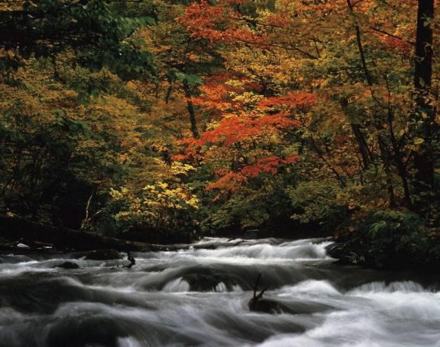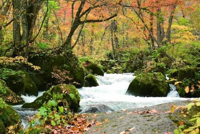 十和田湖の子ノ口から焼山までの約14kmの流れで、豊かな樹木や十数か所の滝と、千変万化の美しい流れや様々な奇岩・奇勝が見事な渓流美を作り出しており、四季折々の自然美を堪能できます。新緑は5月~6月、紅葉は10月上旬に色づき始め、10月中旬~下旬頃が見頃です。