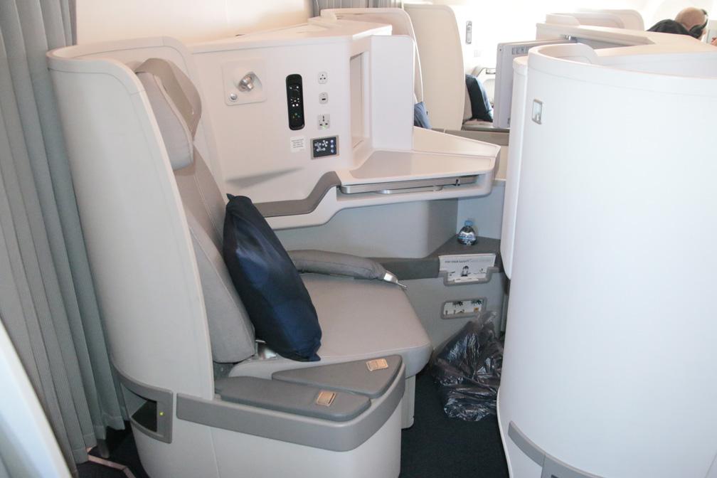 今回は、ビジネスクラスに搭乗しました。水色のシートはフルフラット。リバースヘリンボーンシートは窓側に向って足を延ばす最新型で、窓に背を向けるヘリンボーンシートよりプライベート感がありくつろげます。窓側で斜めになる空間には収納があり、大型テーブルが収まります。通路側はひじ掛けにもなる上下に動くデバイダーとヘッドフォンが入る収納があります。中央席は、隣り合う2名の足もとが寄り添うプライバシーを保ちながら過ごせる構造です。