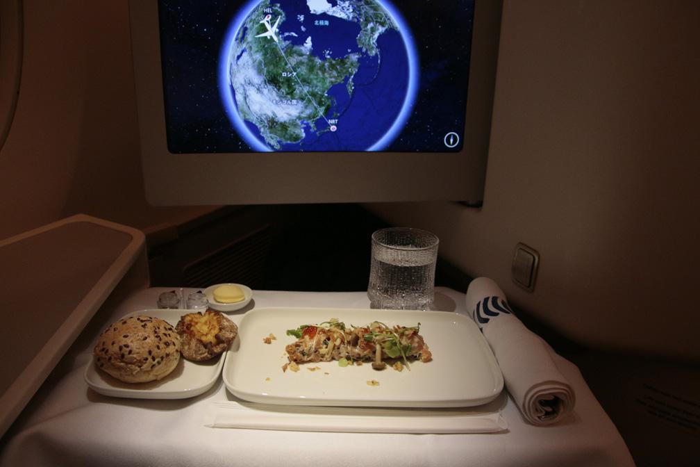 ビジネスクラスは「ノルディックサービス」と呼ばれ、フルコースで提供されます。食事に合わせるお酒は、4種のカクテルや、ジョセフペリエのシャンペンなど。最初にアミューズが登場。サーモンタルタルが皿の上で立体的に盛られています。