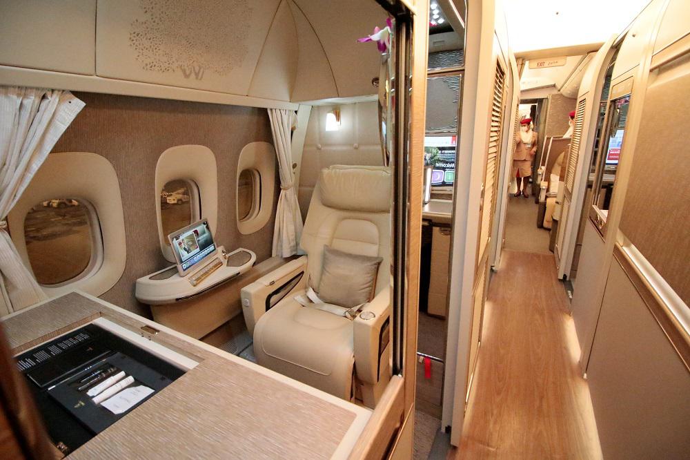 ビジネスクラスの予約を持っているので、最前方のドアから機内に入ると、そこは今まで見たことのない異質の空間が広がっています。ファーストクラスの完全な個室が6室あります。