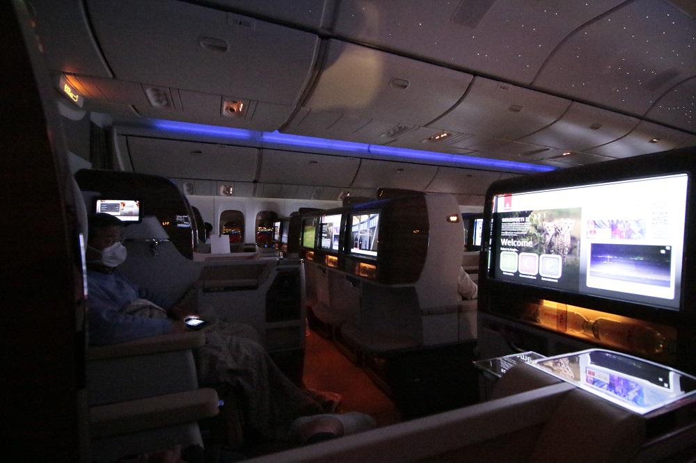 「ice」システムで4500チャンネルの映画を観たり、カメラ付きのTVで飛行経路を確かめることができます。食後は、客室乗務員がマットレスをセットしてくれ、フルフラットシートにセットすると、天井には機内照明で満天の星空が広がっていました。
