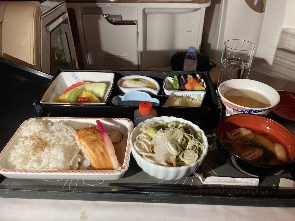 便の到着前の朝食は、日本食で懐石弁当にしました。小鉢が並び、メインは鮭の照り焼き、蕎麦が並びます。フルーツも添えられ、なかなかの見栄えとボリューム。また味も上質でした。