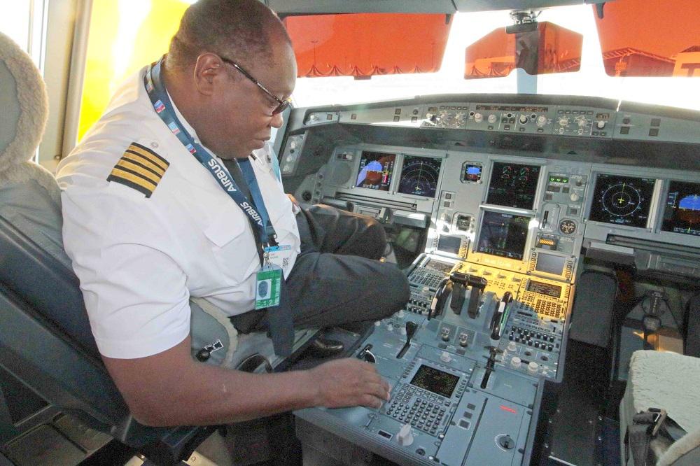 同社のA330neoは少数派の-800型で、エアバスが世界で15機受注したうちの2機がウガンダ航空にあります。ドバイエアショー会場の展示機機内に向かうとまずはコックピットでマサバ機長が迎えてくれました。従来機との違いを新しいフライトマネージメントシステムで説明してくれました。