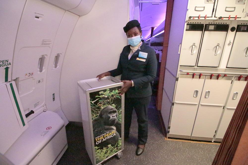 ギャレーでは客席にミール類を運ぶカートの側面にゴリラの画像があり、「Welcome to the pearl of Africa」と書かれているのを見ることができました。どのように美しい国なのかと想像するもの楽しいです。エコノミークラスもビジネスクラス同様にアフリカを思わせる黄土色のシートが並びます。