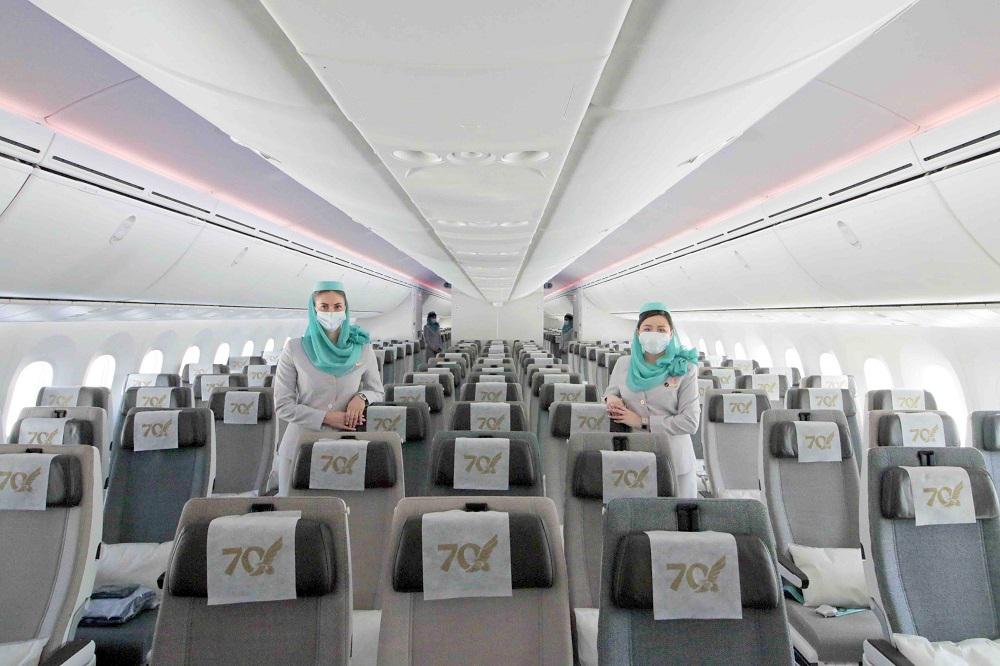 機内に入ると、グレーの制服に鮮やかな青緑色の帽子とヒジャーブをまとった客室乗務員が迎えてくれました。26席のビジネスクラスとなるファルコンゴールドと256席のエコノミークラスを見ることができました。1-2-1配列のビジネスクラスは、贅沢なスペースを使う前方を向いたスタッガード仕様です。個室感が高く、居心地が良さそうでした。エコノミークラスは、標準の3-3-3配列です。ブラウンとグレー系の落ち着いた色合いのシートが並び、70の文字が大きいヘッドレストカバーが使用されていました。
