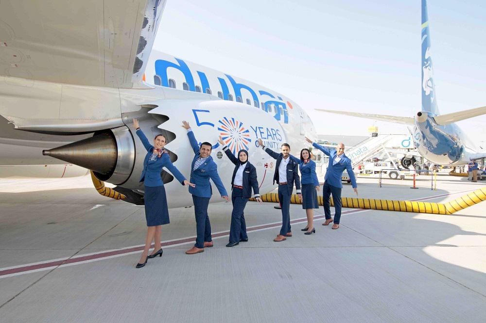 展示機のボーイング737-8Max(A6-FMS)のエンジンカウリングにはUAE建国50周年の記念デザインが見えました。会場では宣伝用でしょうか、客室乗務員が並んで手を広げて機体の前に並び撮影する様子を目撃しました。