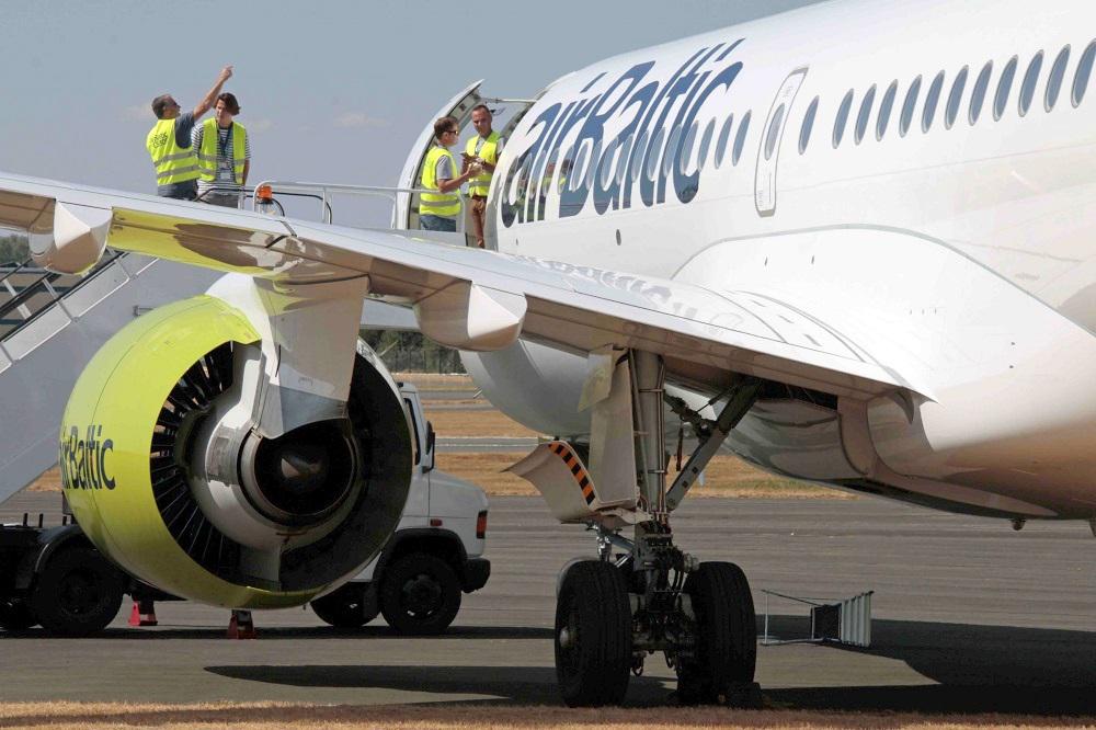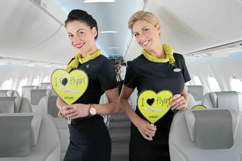 広々とした明るい機内にたつAir Balticの客室乗務員