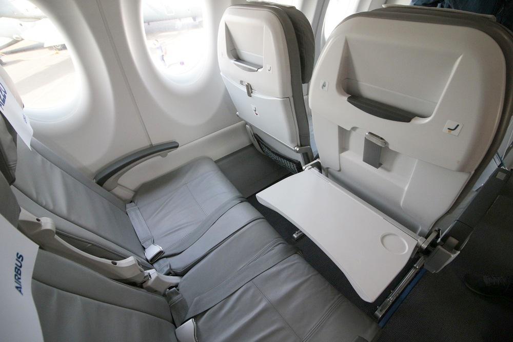 機内に入ると、窓が大きくキャビンが明るく感じます。頭上のオーバーヘッドビンはクラス最大と言います。リージョナルジェットとA320などのナローボディ機の中間の機体幅から、左舷2席、右舷3席が標準となっており、ビジネスクラスでは2-2配列も設けることができます。