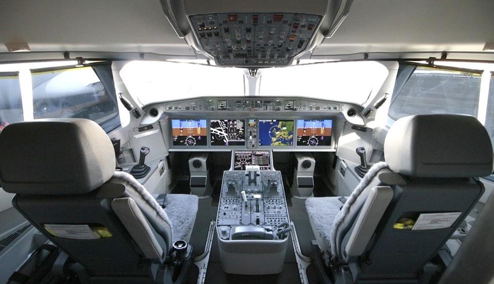 コックピットに入ると、視野の広い前方の2枚ガラスが目に入ります。計器では4面の大型LCDモニターが配列されています。特徴的なのは、従来右席寄りに配置されていた車輪の操作レバーが完全に中央部にあること。操縦かんは、エアバス社と同様のサイドスティックになっていました。