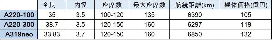 この機体を同クラスのエアバスA319neoと比較した表を以下ご覧に入れたいと思います。