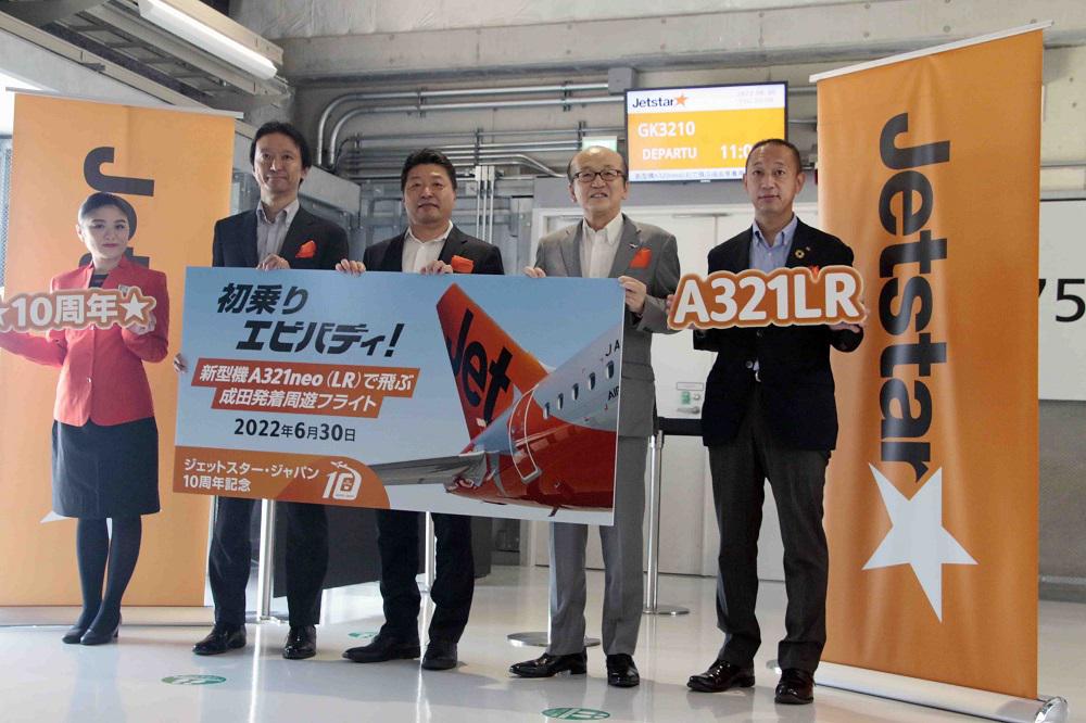 2022年7月1日に10周年を迎えるジェットスター・ジャパン(以下ジェットスター)は、記念キャンペーンで「飛べ飛べエビバディ」とカジュアルなフライトを告知しています。10周年にあたる日から定期就航を開始しようとする前の6月30日に、「初乗りエビバディ」としてエアバスA321neoLR機を使用した成田空港発着周遊フライトを実施しました。