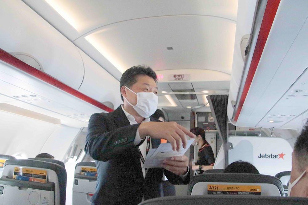 ジェットスターの片岡 優代表取締役社長は、「この機体は満を持して導入したジェットスターのゲームチャンジャーとなる機体です。A320より30%多いお客様を最大9時間運ぶことができ、燃費と騒音を従来機よりも15%減らすことができます。今日の周遊フライトで静かさを体感してきてください。より多くの人に安心安全な空の旅を提供し、旅客需要の回復の引き金にします」と述べました。