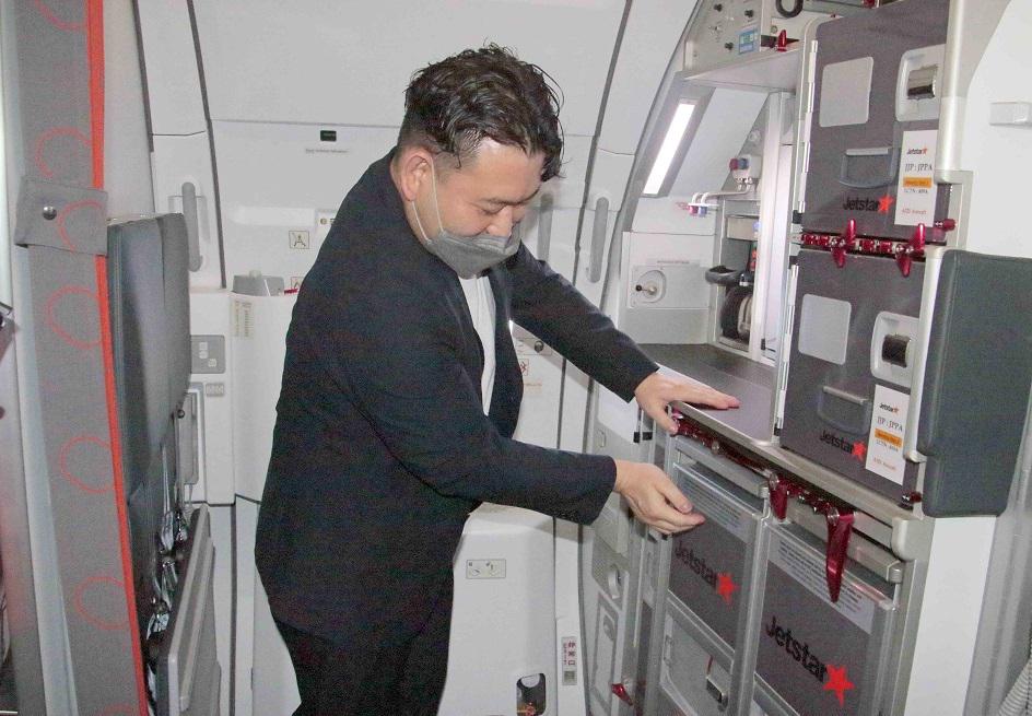 機体後部に向かうと、ジェットスターの客室サービス部長の大塚直純さんが説明してくれました。「最後部は全面ギャレーだったものが、ハーフギャレーとなり、もう半分は2つのラバトリーにすることで、客席部分は高密度の座席配置ができています。カートは軽量化されており、機体重量が減ることから燃費向上になっています」とのこと。