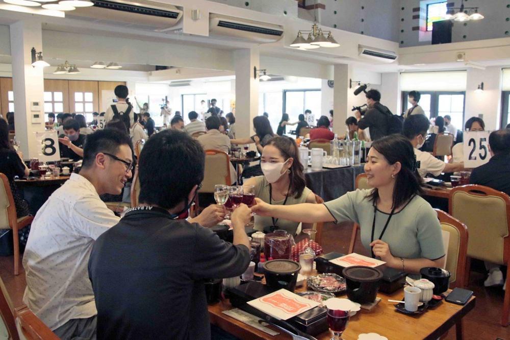 迎える側の出雲市観光課や出雲観光協会からの挨拶があり、テーブルを囲んで地元ワイン「縁結」での乾杯がありました。