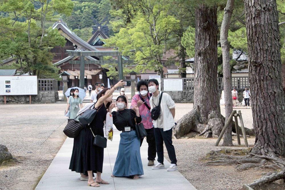 大社入り口の大鳥居前で記念撮影