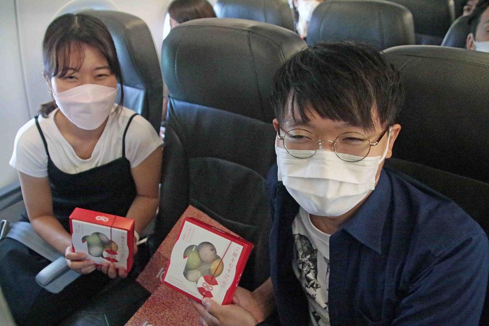 今回、カップルとなった静岡県島田市在住の「あい」さん(23歳)と埼玉県所沢市在住の「りょう」さん(26歳)に帰路の機内で話を聞くことができました。あいさんは「この企画はTV番組で紹介されていたのを見たことが応募のきっかけです。出会いの場が無く、今回はいい機会だと思いました。日帰りの旅でしたが、企画が盛りだくさんで楽しめました。同性の友達もできましたので、良かったです。成田に着くのは遅い時間ですので、急いで静岡まで帰ります」。りょうさんは「グーグルニュースでこのツアーを知りました。飛行機が好きなのと、出会いがあればという思いから参加しました。楽しかったです」と嬉しそうに話してくれました。