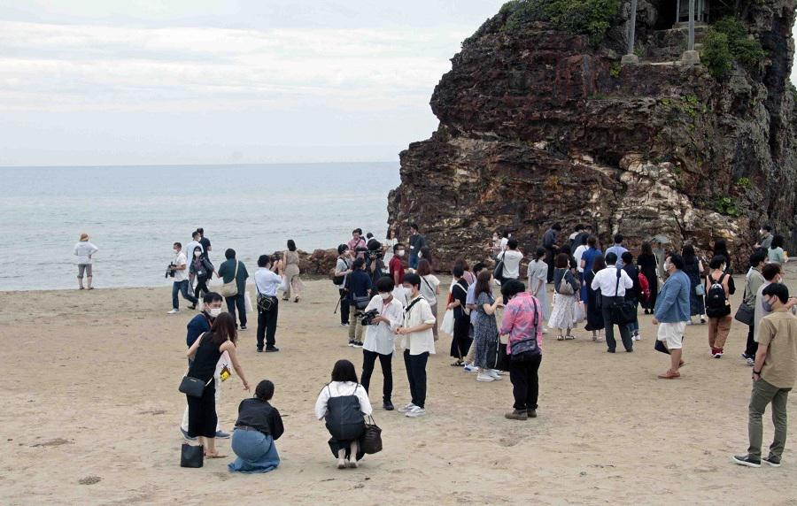 次にご利益のあるという砂を集めに稲佐の浜へ向かいます。同地の砂を出雲大社の素鵞社(そがのやしろ)にてお清めの砂と交換し自宅に撒くとご利益があるとのことです。