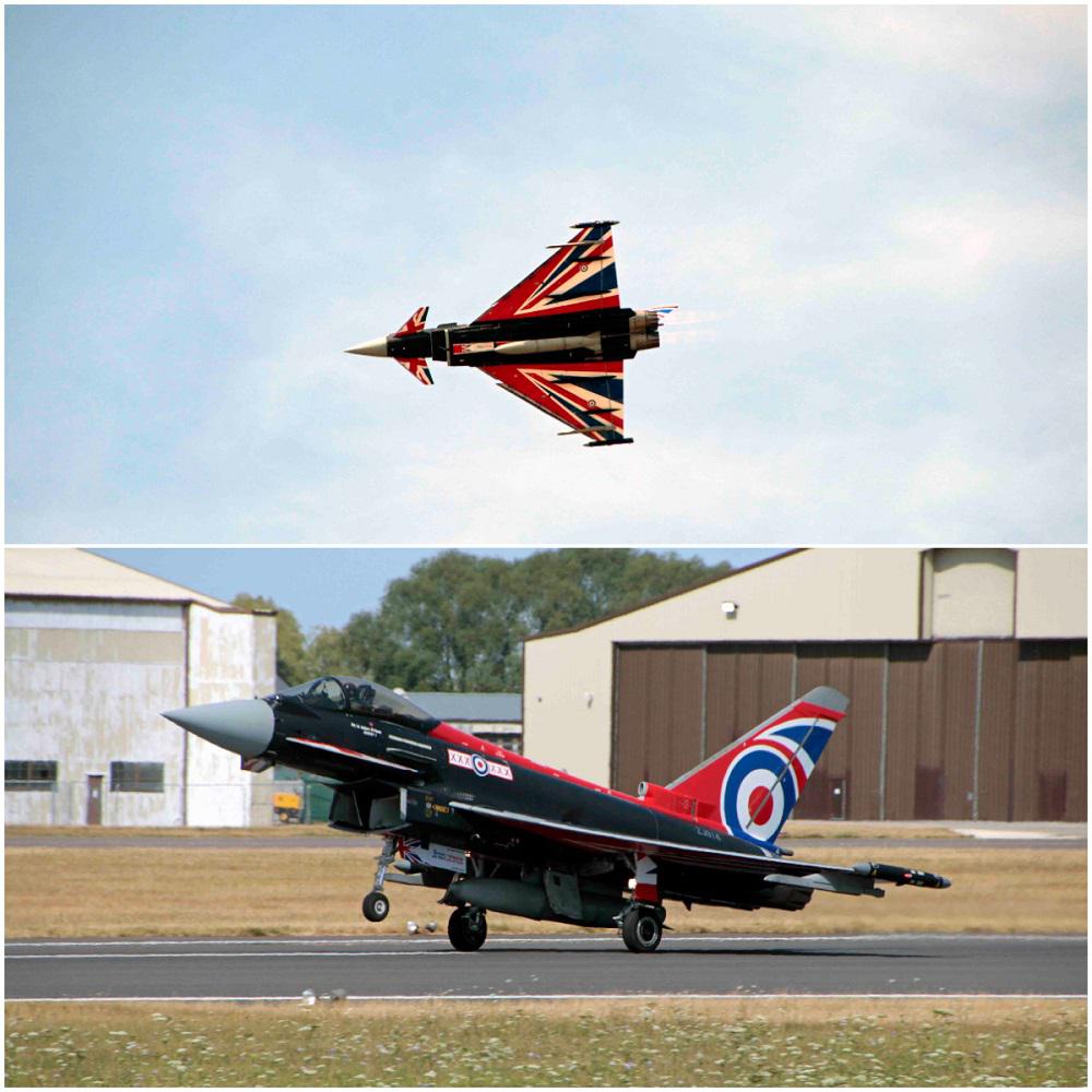 地元イギリス空軍(RAF)のユーロファイタータイフーンはデルタ翼いっぱいにイギリス国旗のユニオンジャックを描き、迫力満点。