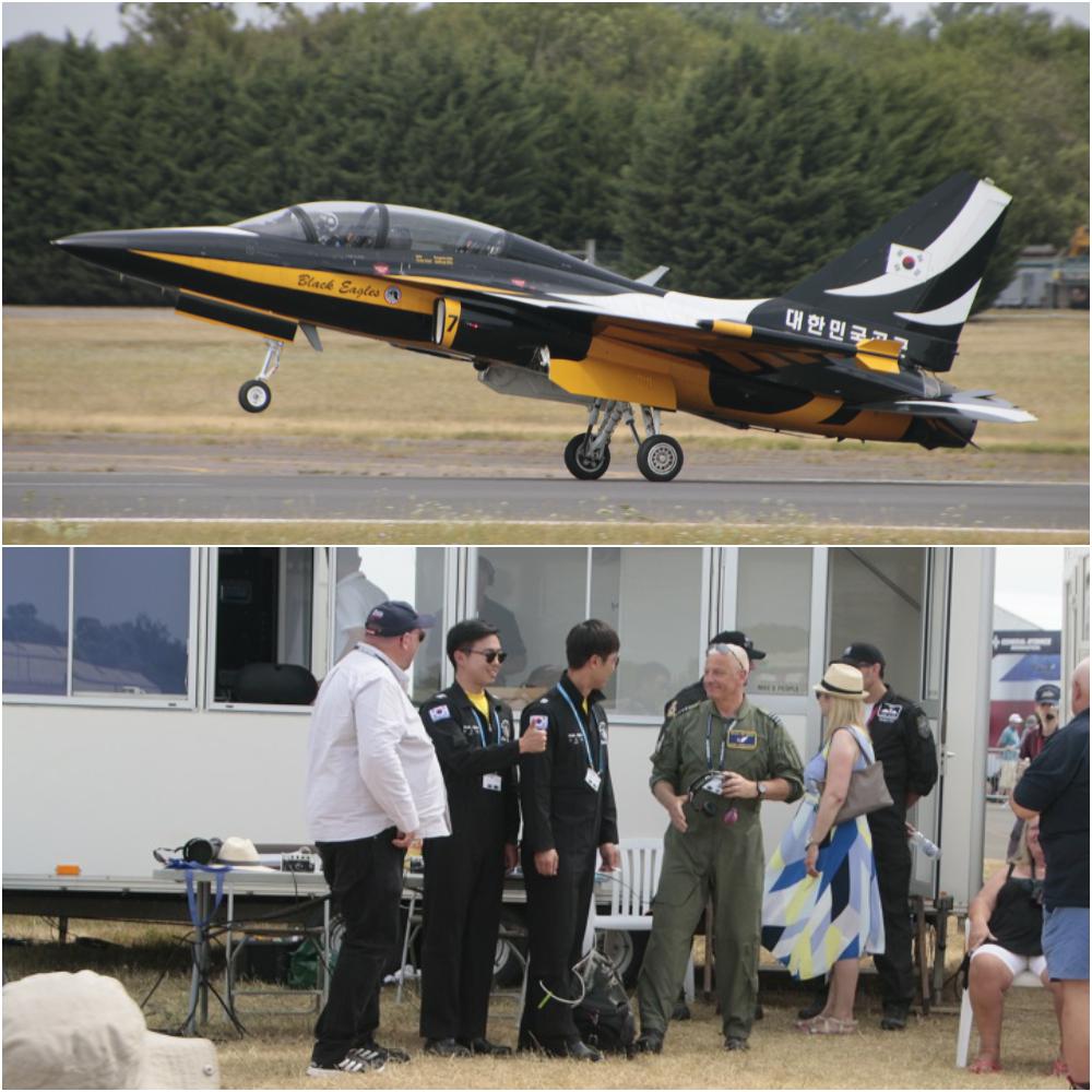 韓国空軍の「Black Eagle」のKAI T-50B Golden Eagle 9機によるアクロバット飛行やイタリアの第313飛行部隊フレッチェトリコローリのAermacchi MB-339PANによるアクロバットも迫力があります。地元RAFは真っ赤なBAE Systems Hawk T1で「Red Arrows」によるフライトを行います。海外のアクロバットチームの飛行は、スモークの色が多色であり、派手さで心を捉えます。