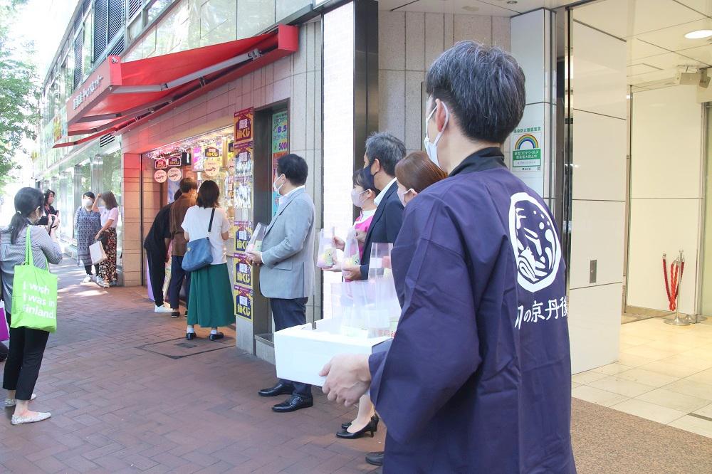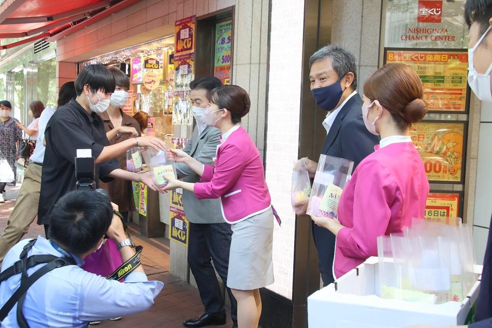 今日は、共同で地方創生に取り組む京丹後市の桃をお買い上げの皆様にお配りします。100歳以上の寿命の住民の方々の比率が全国平均の3倍という長寿の街であり、桃はアジアでは縁起のいい果物と言われます。長寿、繁栄、幸運のこの桃を食べて旅に出掛けて戴きたい。この西銀座からほど近くから、成田行きのバスが出ており、買ってすぐに出発いただけます」と語りました。