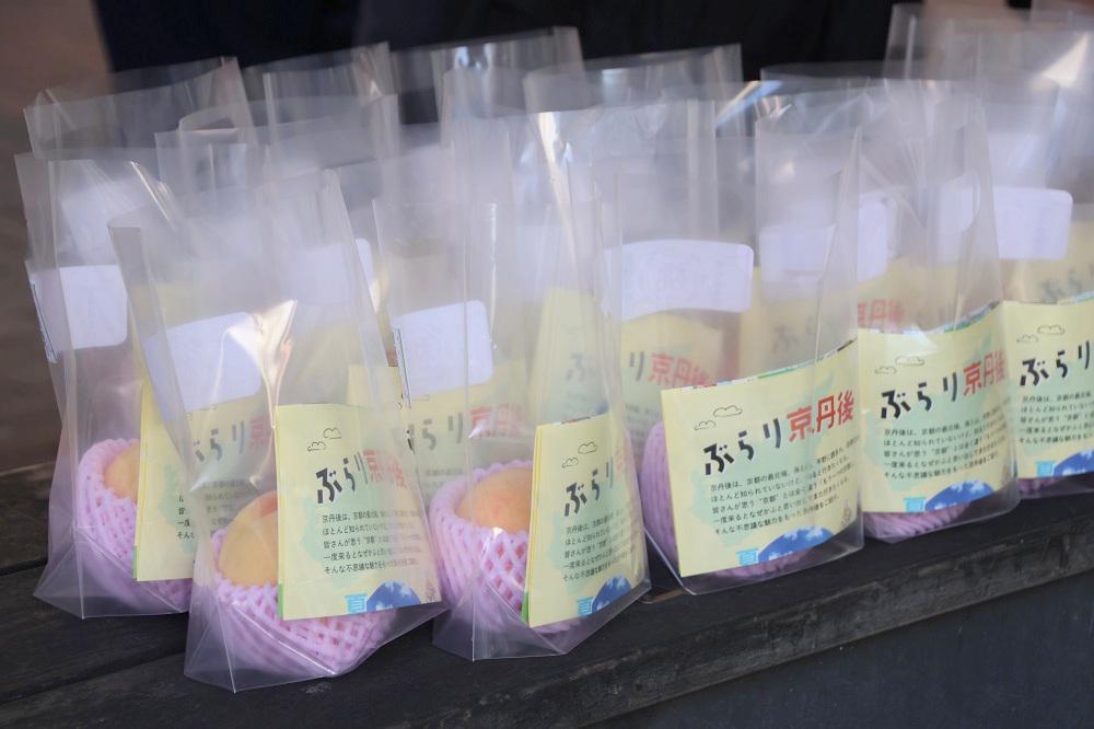当日は空港の無い街にも観光客を呼び込もうと共同で地方創生に取り組む京丹後市の特産品である桃が先着50名に配られました。