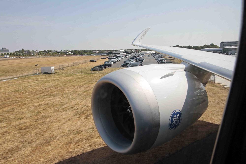 777X機内から見た折れ曲がった翼端と巨大なGE90Xエンジン