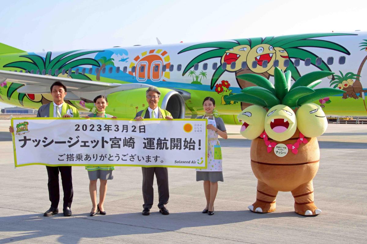 株式会社ポケモンは、2018年4月以降、北海道・岩手県・宮城県・福島県・三重県・鳥取県・香川県の各道県それぞれと協力し、地域活性化として「ポケモンローカル Acts」活動で様々な取り組みを行っています。宮崎県は2020年に本活動に参加。ソラシドエアは宮崎県とともに同社初となる全面塗装機「ナッシージェット宮崎」を2023年3月2日から就航させました。
