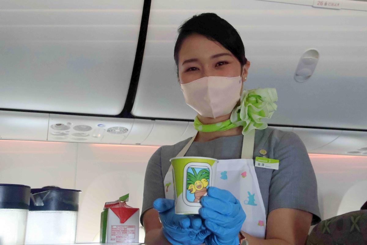 機内では、ドリンクサービスが始まりました。専用カップは全面に機窓に写るナッシーのデザインになっており、持って帰りたくなるデザインです。後方担当のCA釜澤あみさんが笑顔でサービスしてくれました。