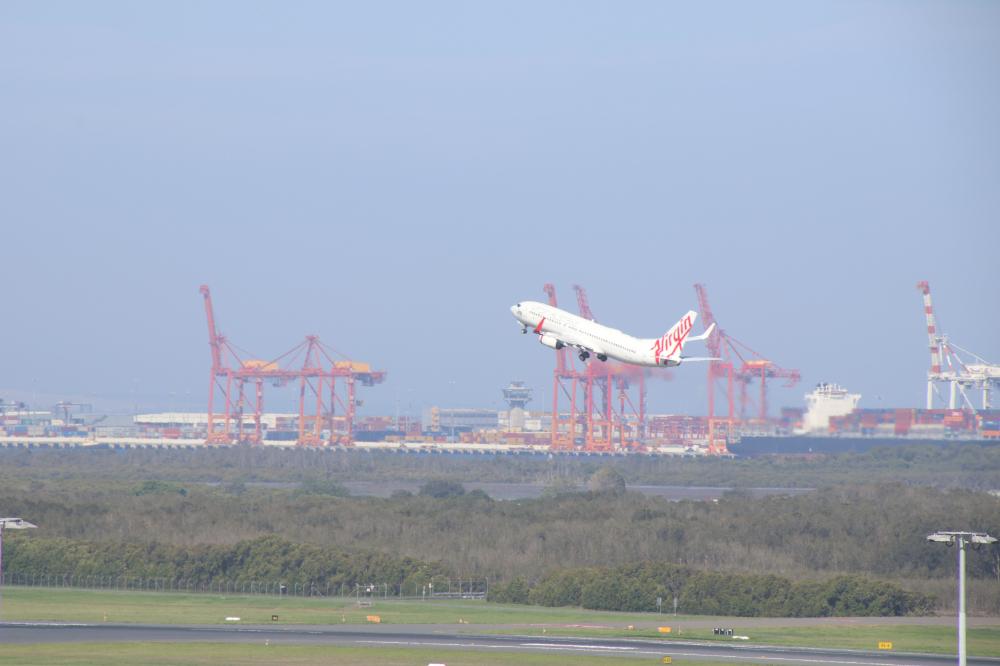 長くカメラのファインダーを覗いていると、お気に入りの光景に出会えるもの。今回は、01R滑走路の延長線上で離陸機が浮き上がるあたりで構えていると、奥のフィッシャーマン島のブリスベン港に停泊するコンテナ船にコンテナを積み込むガントリークレーンと機体とのコラボレーションする光景を見付けました。