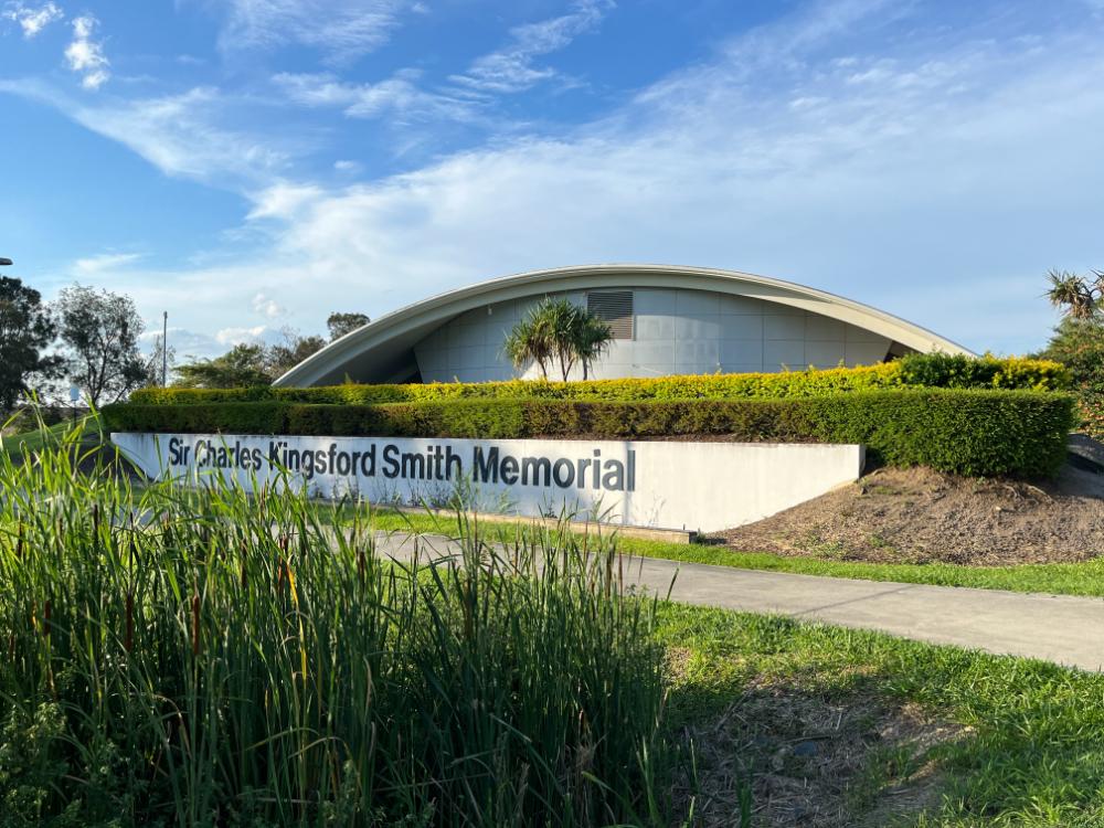 一旦ホテルを出て、ブリスベン空港ホームページの「探検する」項目で見付けた場所に向かいます。国内線のターミナルビルから国際線へ、ターミナル連絡バスに乗って行ってみます。国際線ターミナルビルを出てエアポートドライブを目指し5分ほど歩くと、「キングスフォードスミス・メモリアル」が出現します。