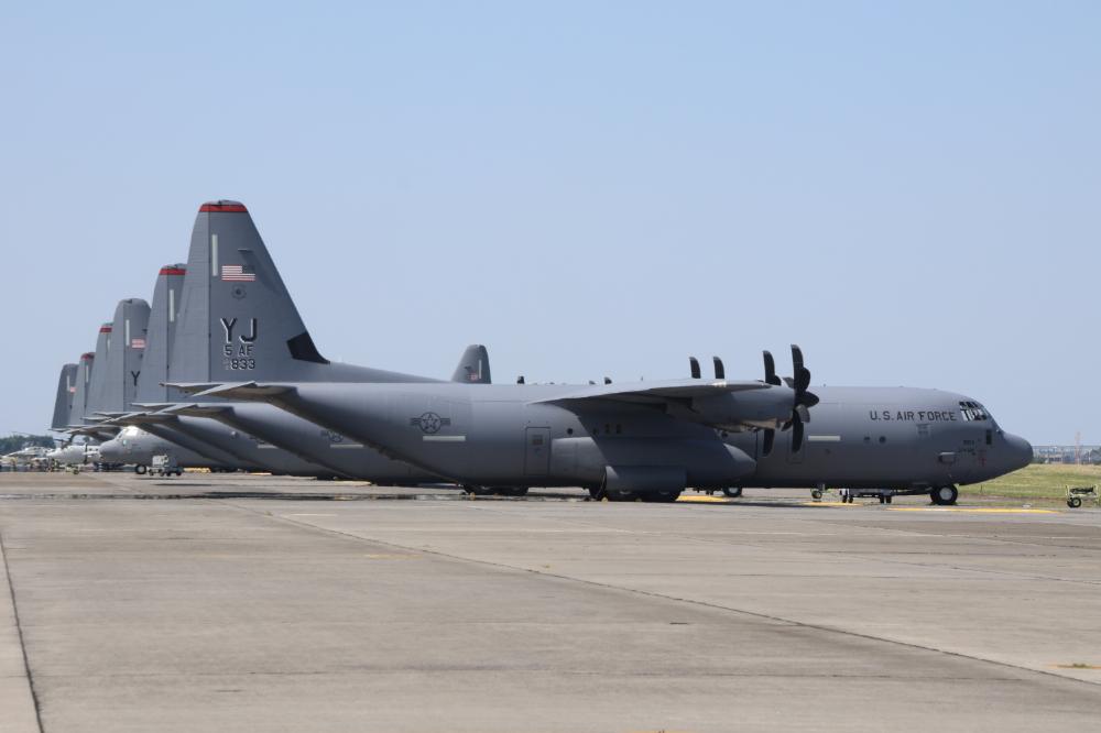 駅からの長い列から厳重な保安検査を通り、友好祭の会場に足を踏み入れると、まず目に飛び込んできたのは広大な駐機場に展示された横田基地所属のC130Hスーパーハーキュリーズの姿だ。北側の駐機場には、ずらりと並ぶ各種航空機の展示が見えた。