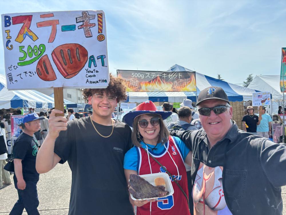 飲食ブースも友好祭の魅力の一つだ。アメリカ風のハンバーガーやホットドッグ、ステーキやバーベキューといった料理が並び、多くの人々が列を作り、それぞれの料理を楽しんでいた。特に、「外人バーガー」のブースは大盛況で、調理するアメリカ人と注文する日本人の短いながらも和気あいあいとした交流を深める姿が見られた。「BIGステーキ500g」という表記で集客する人たちも陽気で楽しそうに働いている。食を通じて文化を共有することで、相互理解がさらに深まることを感じた。