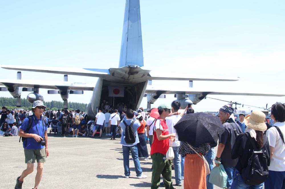 盛夏のような気温となった基地内では、涼をもとめて参加者が地上展示する航空機の翼の下にできる影に入り込んで座る光景があちらこちらで見られた。普段見ることのできない光景に気持ちは明るくなった。