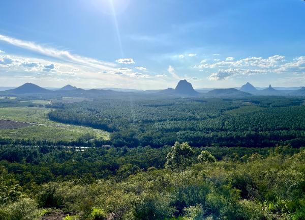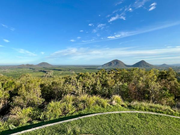 駐車場から息を切らせて登り道を700m進んだ甲斐がありました。360度の素晴らしいパノラマを見ることが出来る展望台に着いたのです。周囲にはグラスハウスマウンテンなど特異な形状の山が並んでおり、映画のロケにでも使われそうな場所です。古い映画ですが、「未知との遭遇」が撮影された米国のデビルス・タワーに似ていなくもありません。