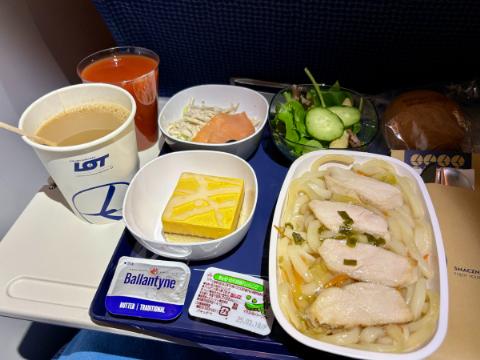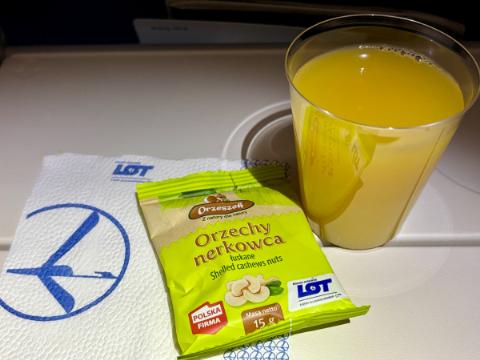 LOTの成田からワルシャワへのフライトでは、離陸後にウェットティッシュとイヤホンが配られました。最初のサービスは、紙ナプキンが添えられたナッツと飲み物の提供です。食事サービスより前のこの小さな気遣いが長旅の始まりを快適にしてくれます。