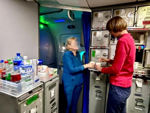 後部ギャレーにはカート2台の上にカップ麺やチョコレートなどのスナック類が並び、自由に食べることが出来ます。長時間のフライト中にお腹が空いた場合でも安心です。エコノミークラス症候群対策として狭い座席にずっと座ったままではなく、機内を歩いてみるのも有効です。ご婦人方が、ギャレーの隅を借りてカフェのような利用をする光景を目にしました。ラフな服装も相まって、旅慣れた感じがとても素敵でした。