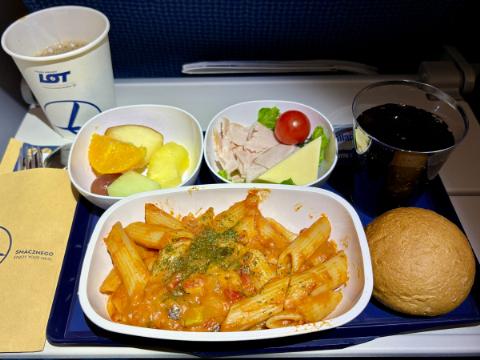 到着前の朝食では、トマトソースのペンネアラビアータが提供されました。ソースのコク深さが感じられる味わいで満足感がありました。
