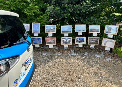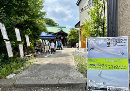 青空のもと、境内にブルーインパルスの写真が飾られた神社は、新たな集客方法を示す楽しいイベントとなりました。写真展のそばには、相川さん個人のブルーインパルスタクシーが展示され記念撮影の背景になっていました。