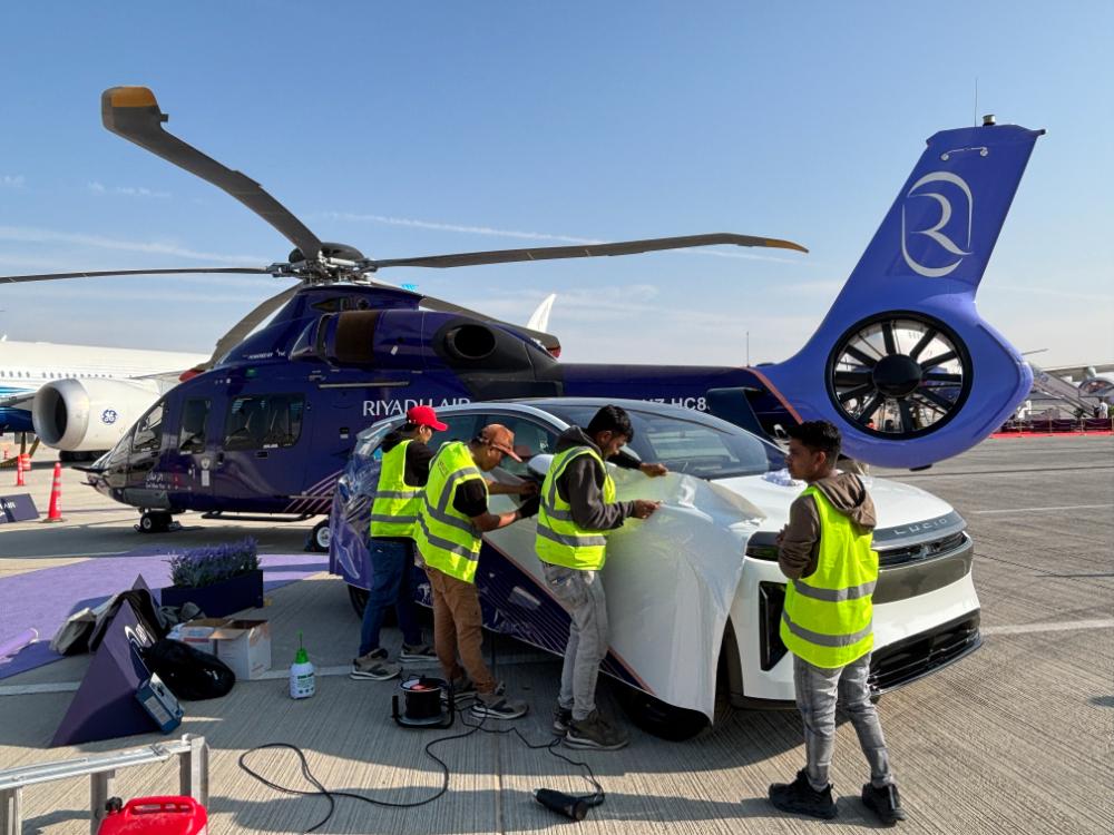 さらに興味深かったのは、このヘリコプターの傍らに、リヤド航空のコーポレートカラーである紫色に美しくラッピングされたルシードの電気自動車が展示されていた点です。