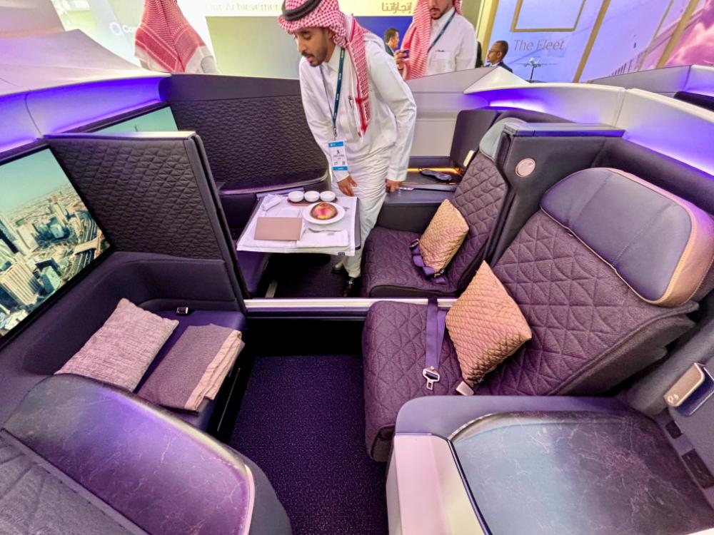シャレー内には、リヤド航空のボーイング787型機に搭載されるビジネスクラスシートがペアで設置されており、来場者は実際に座り心地を確かめ、その快適さと先進的なデザインを体感することができました。これは、デジタルとホスピタリティを重視する同社のサービス哲学を具現化した展示方法です。