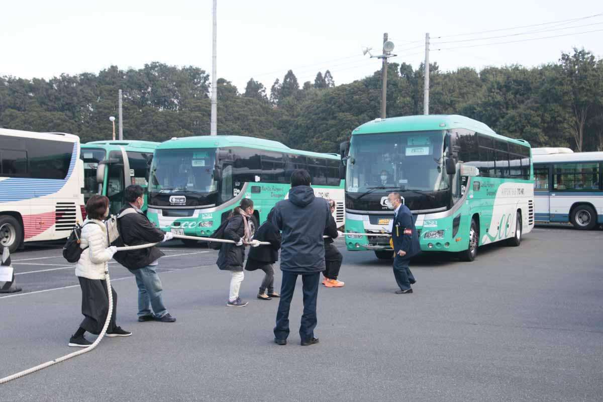 高速バスへ乗換え、車内で万が一運転士が病気になった時のためなどの緊急停止ボタンの操作体験もありました。高速バスとの綱引き体験などもあり、童心にかえったような楽しい時間を過ごすことができました。