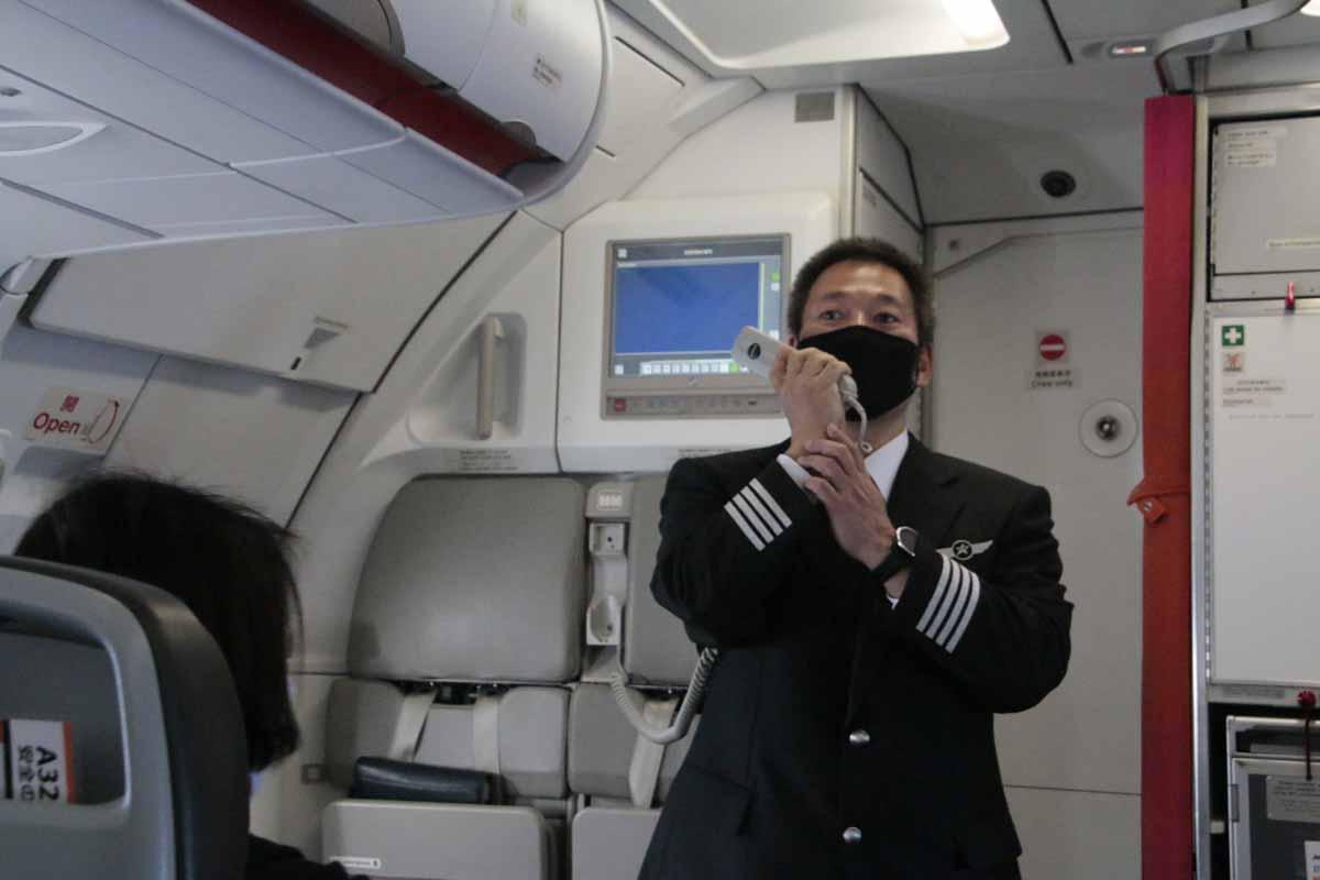 イベントスタッフも乗り込み、機内のあちらこちらで記念撮影の笑顔がはじけます。参加者のアナウンス体験では、いいアナウンス方法の伝授があり、マスク着用でのサービス中には、「笑声=えごえ」を重視すると上手にできると教えてくれました。アドバイスに沿った参加者のアナウンスは、普段よりもいい発声ができたのではないでしょうか。〇×クイズもあり、イベント満載です。