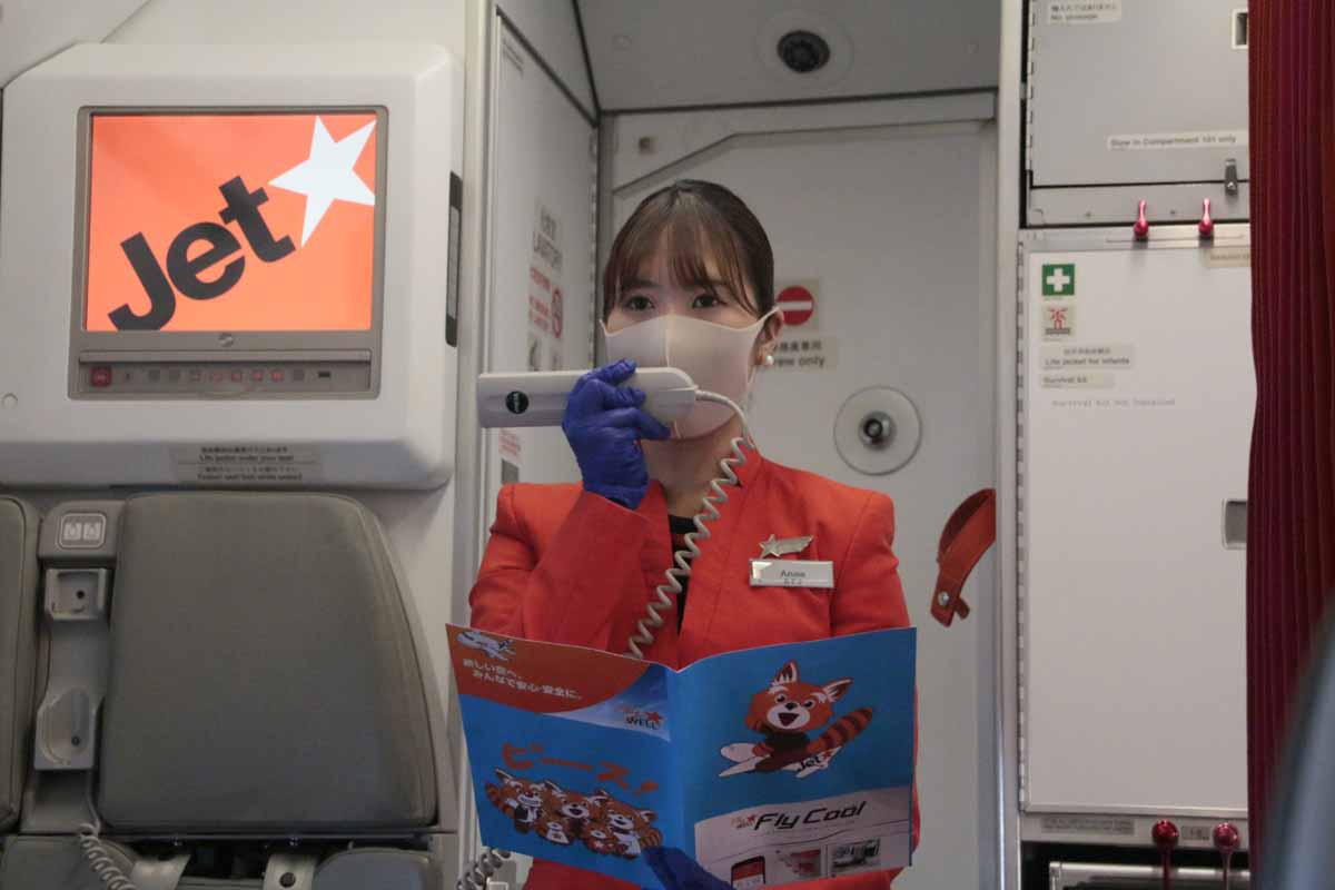 最後はお待ちかねのフライト体験です。第三ターミナルビル162番ゲートからジェットスターGK1003便エアバスA320に搭乗します。ランチの時間に機側での記念撮影が当たった家族、グループが先に飛行機に向かい、機体横にスタンバイしたジェッ太やパイロット、客室乗務員と共に機体を前に記念撮影をすることができました。