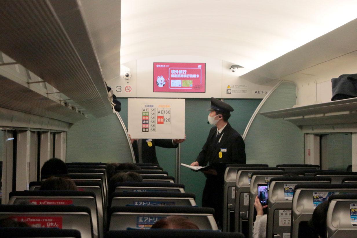 当日、朝9時過ぎに京成上野駅に集まった参加者は、計100名。4つの班に分かれてスカイライナーに乗り込みます。車内では、現役運転士が案内役を務め、実際に走行しながらの車内での解説に、参加者がみな真剣に聞き入ります。
