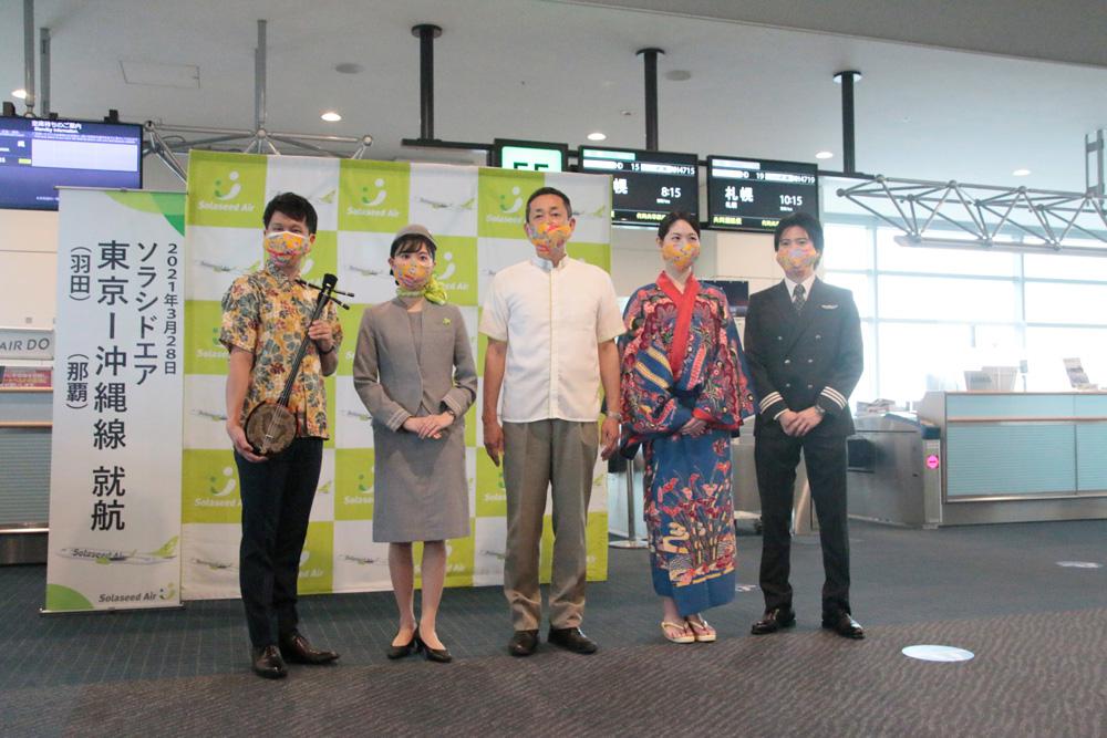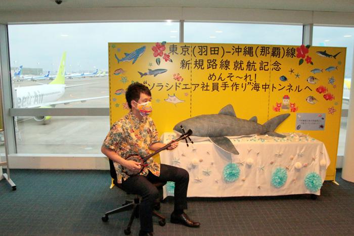 2016年以降、羽田⇔沖縄那覇線は臨時便の運航を続け、実績を積み重ねてきました。幹線であるこの路線への就航で大きな一歩が踏み出せました。本日から、羽田⇔沖縄那覇線は1日3往復、那覇⇔石垣線も1日2往復増便して1日3往復となり、沖縄からは7路線28便となりました。今日は、琉球王国の民族衣装を着た女性社員、三線(さんしん)を演奏する男性社員が皆様をお迎えします。美ら海水族館に監修頂き、社員が手作りで搭乗橋内に水族館を再現しました。ソラシドエアでの沖縄の旅を満喫して頂きたい」と述べ、喜びの笑顔を見せていました。