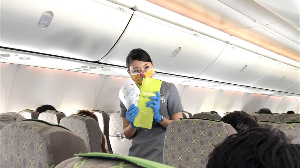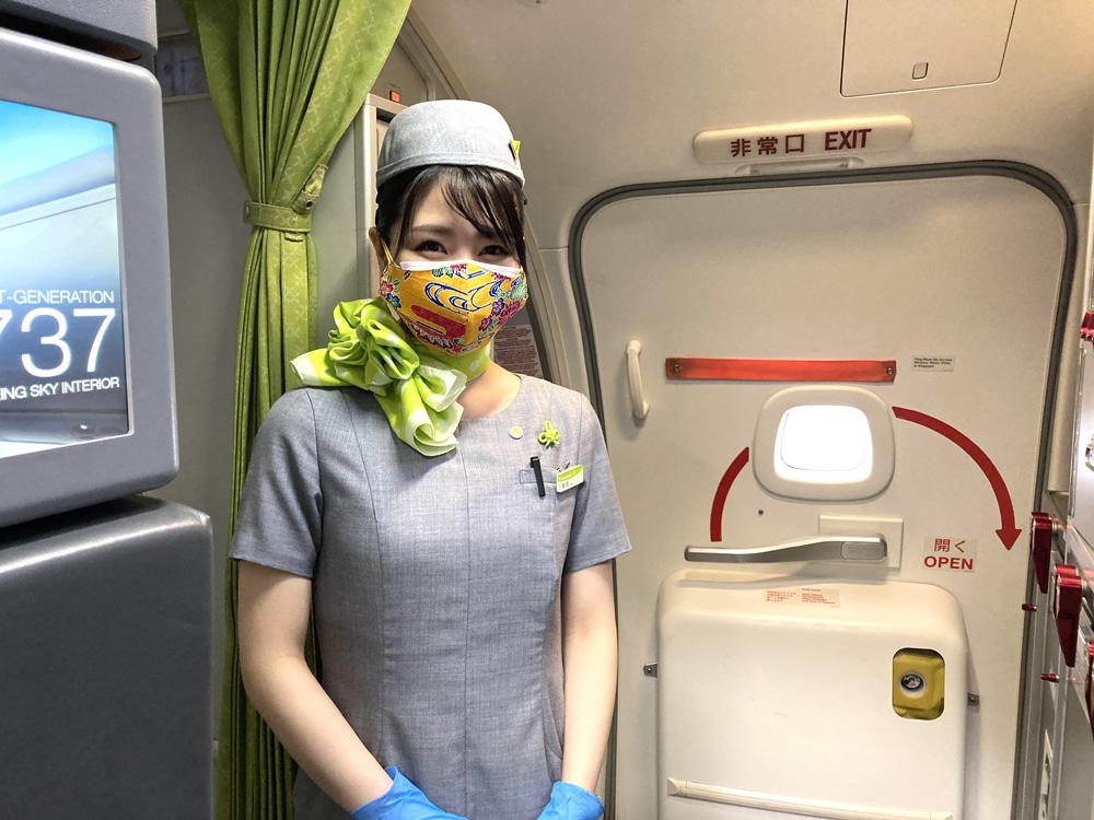 機内に入ると、セレモニーで社員が使用していたものと同じ「沖縄紅型柄マスク」を着用した客室乗務員が迎えてくれました。