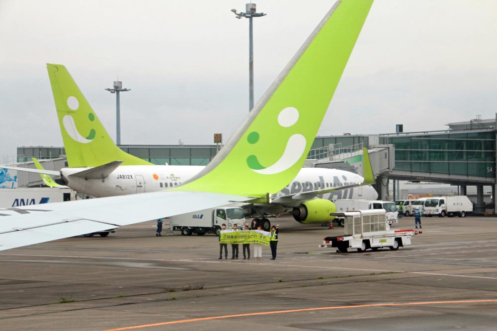 駐機場では、社員4人が「ご搭乗ありがとうございます。2021/3/28 東京(羽田)— 沖縄(那覇)線新規就航」と書かれた横断幕を持って見送ります。