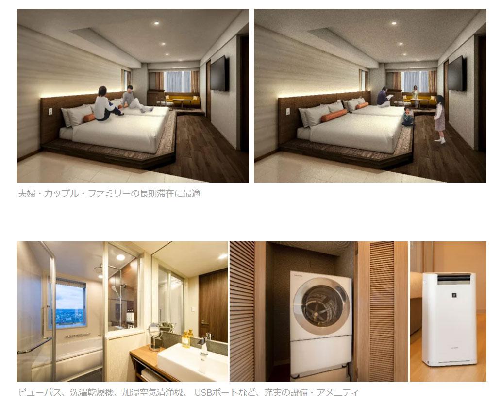 新客室「パノラマ/ハイフロアロイヤルグランデルーム」は、15階以上の高層階に位置する42.5㎡のコーナールームに畳の小上がりスペースを設け、160㎝幅のワイドベッドを2台、眺望を楽しめる窓際にはソファセットと座椅子を配した、ゆったりくつろげるお部屋です。さらに、ビューバスや65インチの大型テレビ、長期滞在に便利な洗濯乾燥機も備えており、ご夫婦やカップルはもちろん、最大4名様までご利用いただけますので、家族旅行にも最適です。