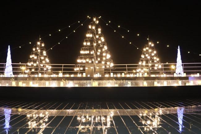 今年のイルミネーションのコンセプトは、ゆらめくランタンがつくりだす光の演出。4階にあがると天井からのランタンが来場者を迎え、マーケット内を抜けるとスカイデッキではランタンをあしらったランタンツリーが登場します。