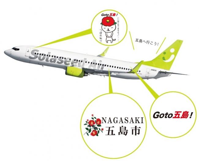 長崎県五島市のプロジェクト機、「五島へGO号」の機体デザインは、五島市のシンボル『五島椿』が描かれている。世界遺産の教会群や独自のキリシタン文化、遣唐使や捕鯨などの歴史、郷土芸能など魅力満載の五島市を1年間アピールしていく。
